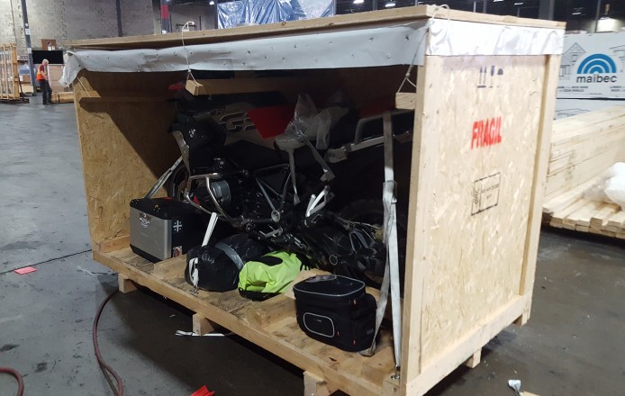 Desmontar la parte frontal de la moto lleva su tiempo. Desatornillar los paneles de la caja de transporte que habían quedado montados. Hacer una rampa de subida, arrancar a Serafina y Arriba!!! si lo ha hecho ella sola!!! ahora hay que equilibrarla y empezar con las cinchas. Proteger todo y meter todas las cosas. Quitar la batería. Atornillar los laterales. Total, cinco horas!!! Miro la caja cerrada y me da un poco cosa dejar aquí mi moto después de un mes con ella. Que no, que no estoy majara, que ya se lo que es, una moto…para vosotros, para mi es Serafina.