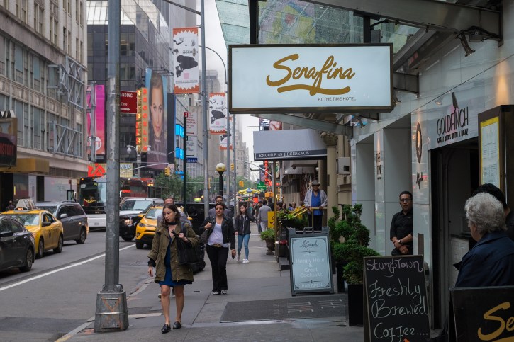 No podía quedarme en Carteret y tener el sábado el problema del transporte a última hora así que, como Carteret no tiene «rien de rien» he cogido el hotel calidad precio mas valorado en tripadvisor, pero céntrico. Son como pequeñísimos apartamentos en la calle 49. Me instalo. No he comido nada en todo el día, solo el café del portugués y son las seis. Vamos a ahorrar un poco y ya que tengo una cocinita me voy a una tienda y compro comida. Food Emporium, se llamaba. Un platillo de fruta, dos patas de pollo, unas magdalenas,unos espagheti, unas tortitas de pan, cocacola y dos cervezas. Cuanto? Échale, así, a ojo… Más, ni te acercas, más aún.. 66 dolares americanos!!!! SESENTA Y SEIS!!!! y no se ha confundido!!! 15 $ el plato de fruta. No me extraña que vivan a base de hamburguesas. Casi me da un infarto. Así que el motero de San Francisco me dijo que el ganaba unos diez mil dolares al mes. Chaval!!! tu eres un pobre de pedir, con eso, patatas fritas y los fines de semana hamburguesas y ni sueñes con una pera los domingos!!! A la vuelta del super, un poco enfurruñado, paso junto a un hotel. Y? Como se llama? SERAFINA , me sale una sonrisa, se me olvida la clavada, hago una foto y al apartamento.