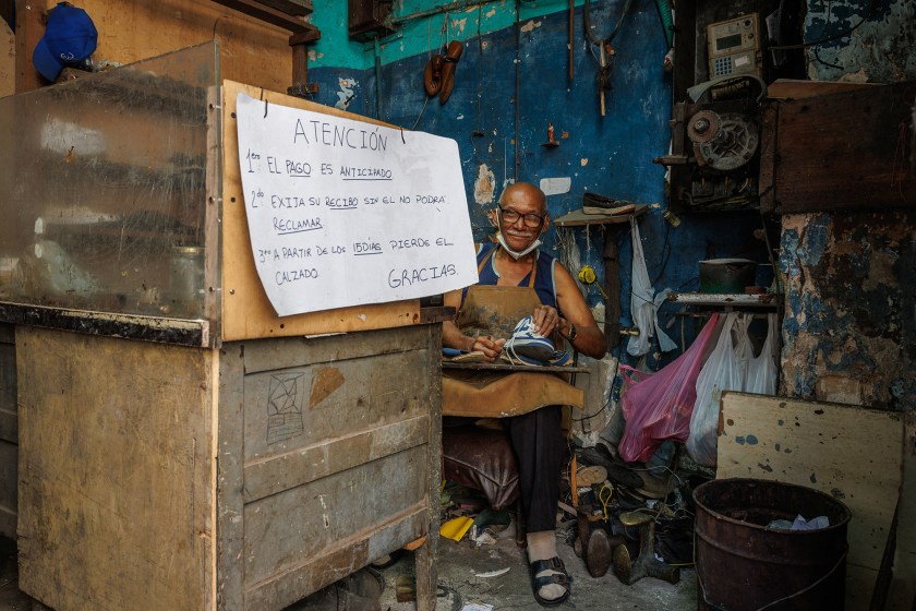 Avanzo rápido por Neptuno contemplando escenas callejeras pintorescas y tomando buena nota de ellas. Llego a un colegio. Las ventanas abiertas pero enrejadas me permiten ver y oír a la profesora impartiendo una clase de gramática española a los niños. Contiguo al colegio hay un zapatero remendón, un local muy pequeño. Dentro está sentado Dionisio cosiendo unas sandalias. Tiene 89 años. Fue militar rebelde, después camionero y ahora zapatero. Cobra una pensión pero puede trabajar para complementar. Me habla de su paso por el ejército, de lo que aprendió allí, de la suerte que tuvo, pues gracias a ello ha conseguido este local que le han intentado quitar varias veces pero su expediente lo ha impedido. Hablamos de los «Españoles» y nos lanzamos puyas mutuamente, nos reímos y se suma un amigo suyo que pasaba por ahí. Antes estabais por encima y os mandamos para casa y mira como estamos ahora, sonríe. Me cuenta sus problemas de próstata, que sangra de vez en cuando y que está en lista de espera para que le atiendan, no tiene dinero para hacer un donativo y que le atiendan antes… en la zapatería le ayudaba su hermano menor pero se lo llevó la pandemia y ahora está solo. Me despido con un apretón de manos y otro nudo en la garganta.