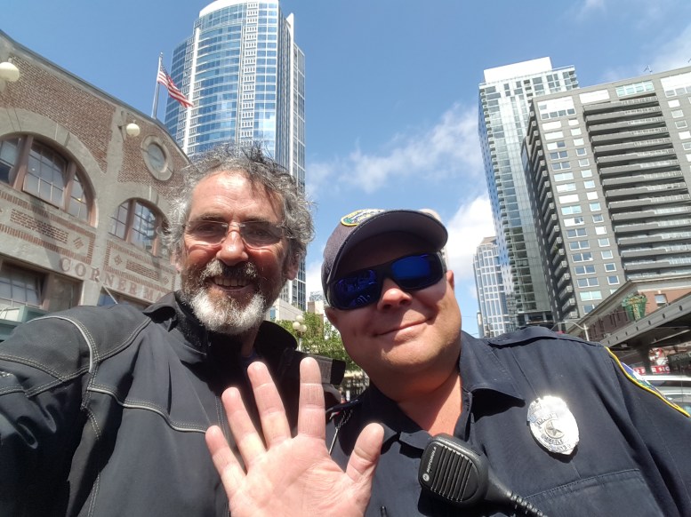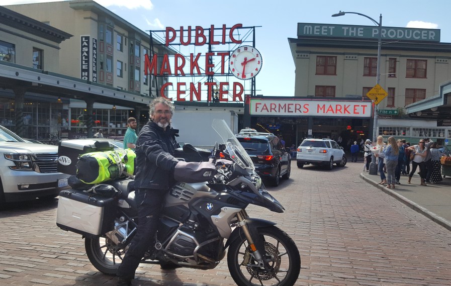 No diré lo mismo de esta ciudad a la que acabo de llegar, Seattle, la ciudad de la lluvia, en el estado de Washington. He llegado solo para comer y dar una vuelta, mi objetivo es Vancouver, ya en Canadá. Ni llueve, ni veo mendigos y veo una ciudad preciosa. Una Noria gigante, puerto de recreo, el famoso Pike Place Market que es un mercado bullicioso, no apto para motos. Aquí no hay quien aparque y menos quien se atreva a dejar la moto sola con todo lo que tengo al aire. Me acerco a lo más concurrido y la señora de información sale y me dice que se puede dejar 30 minutos, que luego multa o se la llevan. Me quedo allí como un tonto. Una pareja acepta hacerme una foto, les digo que con la moto en medio de la calle. Aceptan. Corro a por la moto y se me cae el casco del espejo al suelo. Ya van tres, en fin… Después de la foto y de devolverles el favor, vuelvo a mi sitio. Aparece un agente y me dice que mi tiempo está expirando. Vaya hombre, con lo bonito que es y no he entrado. Charlamos. Su mujer es Mexicana y muy guapa a juzgar por la foto. Me dice que la mezcla de Mexicanas y españolas da un resultado fantástico. Me pregunta por mi viaje. Al final, se enrolla y me dice que entre al mercado. Jolín que majo!!! Los pescateros me dedican un juego malabar con una merluza jajaja. Al cabo de un rato vuelvo a por Serafina, me despido del agente y me voy. Que lástima!!